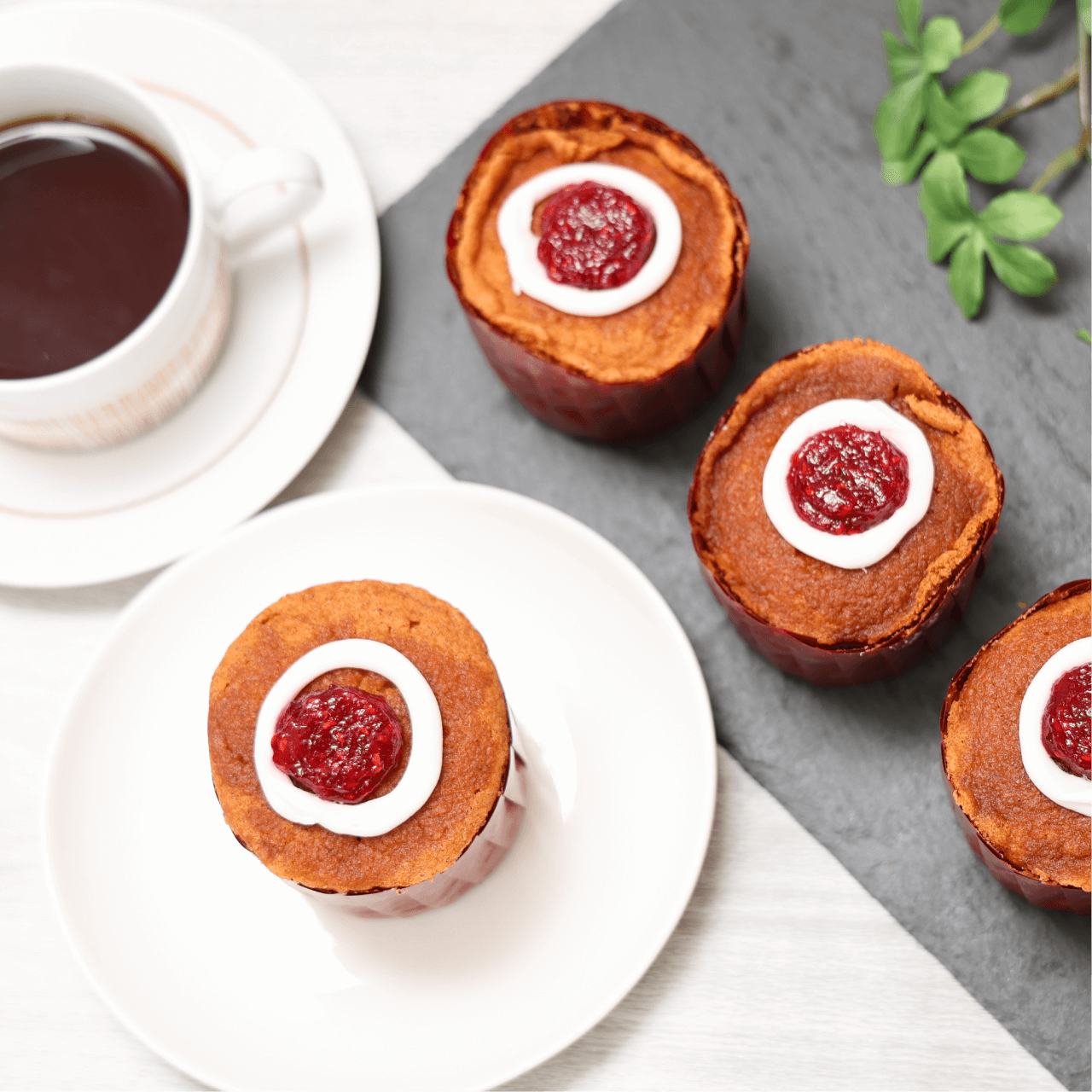 カルダモン、シナモンと砕いたジンジャークッキーを練り込んで焼き上げられたスパイシーな生地の円柱のカップケーキに、ラズベリージャムがトッピングされ、ジャムのまわりはかわいくアイシング。
